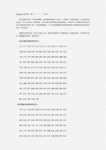 一起看,我相信对你有帮助。 宝宝命名大全蛇年宝宝命名用字1 :“马”、“羊”字巳(蛇)和午(羊)、未)羊)是三会,三会意味着贵人会帮助蛇宝宝。 选择这样的字比较合适。 用于命名蛇宝宝的字2 (宜带构造中有“田”字。 因为在我们的印象中蛇在田野里活动。 “田”有四个口。 如果蛇宝宝的名字里有田的话,那就意味着有足够的藏身之处,意味着富贵吉祥。 蛇年宝宝命名用字3 :最好带“口”、“宀”、“艹”字。 蛇喜欢在洞里生活,平时出没在草丛里。 蛇宝宝采用“口”字旁边的字、宝盖字,还有草字,意思是适合那个地方。 福禄双收。 以蛇宝宝命名的字4 :应该有“心”字根的字。 蛇是肉食动物,所以名字上有心,或者在树心旁边,蛇宝宝就会吃喝,也就是说有福禄双收的意思。 蛇宝宝命名用的字5 (宜带结构中有“木”字。 蛇宝宝的名字上有树就表示蛇在树上,象征气势上龙。 这样的寓意是美化吉祥,增添繁荣之势。 以蛇宝宝命名的字6 )最好有蜿蜒的根字。 例如,上面有“辻”、“廴”、“弓”、“什么”、“己”、“虫”旁边的字。 传统上,蛇宝宝被认为有助于迎接挑战,增强斗志,繁荣事业。 用于命名蛇宝宝的字7 :有“衣”、“采”、“巾”旁的字。 这些字也有增加气势和运势的意思。 在中国文化中也有蛇披上五颜六色的衣服变成龙的说法,所以这样的字也是吉的。 以蛇宝宝命名的字8 :应该有“蛇”、“鸡”、“牛”结构的字,巳(蛇和酉)鸡)、丑)三合,意味着在贵人的帮助下增进事业。 与鸟有关的“羽”旁的字和“牛”旁的字适合蛇宝宝。 这一类也是适合选择的字。