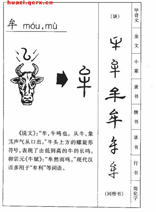 (1)会意。 甲骨文字形。 表示从牛手中拿着棍棒牧牛(羊)。 本义:放牧牲畜。 )同本义。 ( m读,意()放养牲畜,) (古)官名)州(。 [牧师]基督教神父、教务管理、宗教仪式主持等。 4 .治理; 主管