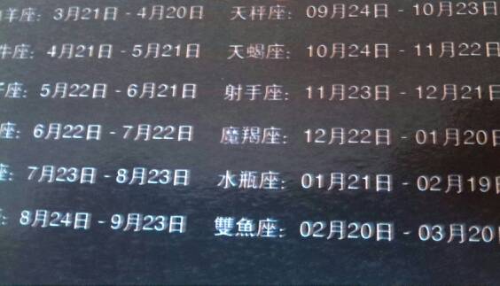 白羊座3月21日~4月20日 (金牛座4月21~5月21日) (双子座5月22日~6月21日) (巨蟹座6月22日~7月22日) 狮子座7月23日~8月23日) (处女座8月24日~9月23日) (天秤座9月24日~10月23日) (天蝎座10月24日~11月22日) (射手座11月23日~12月21日) 魔羯座12月22日~1月20日) (水瓶座1月21日~2月19日) 双鱼座2月20日~3月20日)白羊座3月21日~4月20日 金牛座4月21~5月21日 双子座5月22日~6月21 巨蟹座6月22日~7月22日 狮子座7月23日~8月23日 处女座8月24日~9月23日 天秤座9月24日~10月23日 天蝎座10月24日~11月22日 射手座11月23日~12月21日 魔羯座12月22日~1月20日 水瓶座1月21日~2月19日 双鱼座2月20日~3月20日