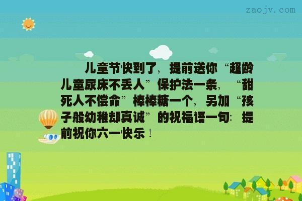 3、儿童节快到了。 我代表领导,向奋战在聊天一线的各位致以最深切的问候。 而且,我希望你记住我告诉你的。 把互联网搞好,每天上线。 儿童节快乐!