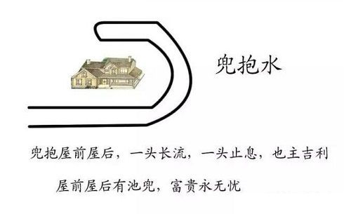 门前有圆池,唤作当胸槌。屋边水环绕,仓箱应不少。周围四相抱,富贵多珠宝。