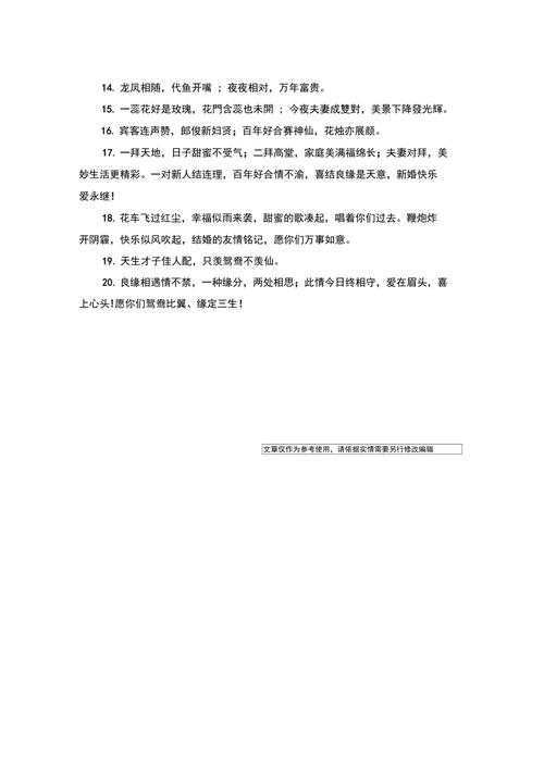 2、用甜言蜜语认识,一起共度一生。 心心相印,互敬互敬,真心互敬,共度一生。 不分手同甘共苦,永远白发苍苍。 家人同乐,美女双全。 祝新婚愉快,幸福。