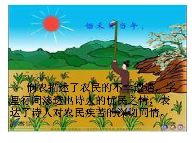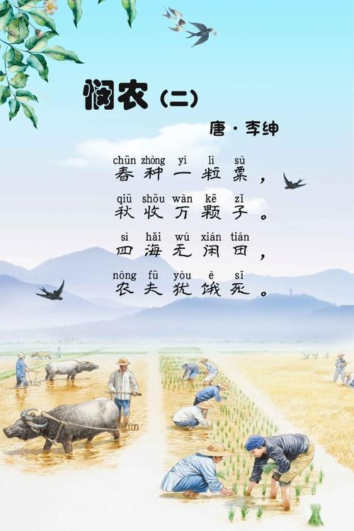 第二首解释:农民正午烈日晒锄,汗水滴在身上长苗的土地上。 谁知道盘子里的饭菜? 每一粒都是农民用辛勤的劳动换来的吗?