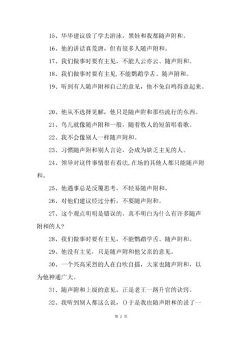 2、附和。 跟随别人的话应该和谐,没有自己的意见。 人在说什么,自己在说什么? 没有自己想过,没有自己意见的表现。