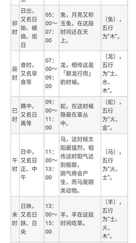 古人把一天分成十二个小时。 所以,每个时间等于现在的两个小时。 传说该划分方法根据十二生肖动物出没时间命名各时间; 十二时辰分别为“子时、丑时、寅时、卯时、辰时、巳时、下午时、未时、申时、酉时、戌时、亥时”。
