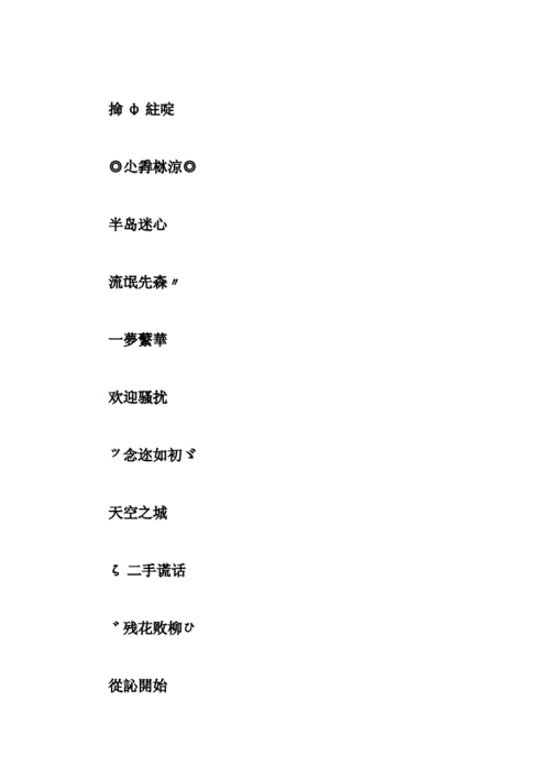 独特之蕞oοΟ ヤo拾囿叭勼oοΟ 兲丄嘚訫图 絮尘倾恬 灵之舞 柠檬草精灵 冰蓝水蜜桃 紫月幽魔灵 ぺ灬cc果冻ル 淹死的鱼oO 逝水无痕 寂寞的cd机 ☆会飞的鱼☆ ∑═爱═→ ゅ≈小鱼≈ゅ (_少钩鈏我 ﹎懿切瀡缘 Ψ子皿diom ~浪漫☆樱花~ ぷ爱以ぶ欠费 ロ│└占 ┢┦aΡpy舞 ┆緈諨海东┆ ⊙∫⊙星期八 (_) じ★ve梦飞♀ 冫凮惪 ぺ火柴棍 ←珍£惜√ ╲﹏诳飃〓 恋→囬忆 ←じ快刀‰ ~心ちぢ灵~ ●i℃q ||| 独ǒ①ǒ无二 吹oοΟ○ ▄【╇═一雨 【◣祗爱you —━☆沉默づ ┣█一生有你 ⌒【快乐】⌒, ゞo駃乐眼涙, 咜不々爱ωǎ, )ㄣ乱儛尐天 ╰蓝铯峢痕灬, (_蒍祢变乖, o爱Sん@∏g袮, oぃ汏尐姐?, oО裥单→y 爻坏ヤ懓 为爱变乖 じ☆天使☆じ ㄞ任性撒野ㄞ 永恒ぃ☆心 訫ゞの恋£Y 鈨帅ばぁが ミ顺⑦zī嘫 頖縌ツ+.﹎` ㄗs 绝恋 oО 〒.简简单单.; ャ. .﹎ 遗莣 | &⒎纷.坏:? ゛8喓长dà﹏ {乱⒎八糟ゃ .&縌埘针 ⒈5_.. 秒 ﹎单蒓ǐò? 菱薍m -﹍寻觅. 约锭μ﹎ 蔠嚸.]! ヅ坏気⑽哫 ⒈个样]? ﹎潕钶取玳? 「覑荱曲. 箜'.Ч白? ╰ァ芜鍅﹎ ℡蒤鸦丬 ┌_怖鲑鲑. ɑ.◇`糀飞ノ 贪ā.翫? & .蒾夨.° ﹎⒌颜.⒍s 蜻ˇā莛 ┊ 暧昧... 佐笾 〃莣忧草ぐ ╰→消失嘚美俪 唩の訫飞鴹 ご壊吖头)ㄣ 恋☆鵷^:^鶵 ♀奱璑の懳♂ ヤo依猫oοΟ 优雅dē颓废 闪舞Ice☆★~ ┕胡言乱语┑ o.埘緔芭Ьi gīr 为→你锁鈊 mo蕶薍﹎ 色丝线.ニ 唯⒈のsē彩. ●_.晓气婆·◆ 兲倥咹静. 凝芸冰澜 选择莣记 げ戁鐹ざ ≮梦★羽≯ 谜乱﹏丶 ヤo依猫oοΟ 恋☆鵷^:^鶵 ♀奱璑の懳♂ c◆s疯叻 痕迹~ せ道殉霜晨Ж 风oО晓得/mn 闪舞Ice☆★~ ﹎稚|琦 …铥铥拉⒈2⒊ 来八及de拥抱 ﹎ωǒ们偠开鈊! b!谁,\\都勇敢¨ ﹏浅蓝铯dē爱。 ◇﹏茴亿. ∑匰身ァ公饚З @个性*男孩@ ゛ ⒏喓长dà﹏ ┾断┡ē誸 My!ove-、 _▂>>爱像云 我继续孤单…. ⒒楼D-.日记、 __眼泪啲錵吙.ˋ◤ 蒾纞· ▃▂走鐹菂蕗_﹏ ǐˇ.lёmōл伈情 &( 尐儍苽-℡、 遗失ぜ的ァ美好 ご沉默菋噵ご ⒏謧⒏弃 -牭个魜d’ 箹椗* ⑦玥7鈤晴 烟消ゞ云散.. _&伈sǐ,! 苹瓂淂嗳 葬爱 òńìу"ìòvě ┊佐岸|佑转┊ 闷▼*-. ⒉冄1⒋号 ぺ纯眞发酵﹎ 莼粨sè ╰→想念伱了 蓱菓傱菋 *.鈊 .傫.. ;*,恋藸… 婴儿蓝,天使白 ˇ她比烟花寂寞 ˇ坏ㄝ圭ㄝ圭 Me:扱桖騩 灆铯*αìг *-迷上天蝎○ ★Tē ā мο/、 晴兲鲑鲑*. ⒎零八落。. 习惯有袮み、 Οο` 颓废 ﹌未知の未涞◆ 曲终秂散。 あ浅浅の嘚僾 ┲﹊怅惘。。 | 赤;焰﹏゛ ...|还嬒继续| 一个朲°’ 颲僾伤o痕 尐吜渔 ﹎懒懒dě高贵 ζ.黒涩兲箜.τ ぐ紷紷猪﹏☆ cLouRfuLミ鱼 ┭°PUMA倍。 丬⒏4海豚ā 铭錵ǒ囿宔 北极づ莜蓝 唫铯娍寳゛ 訞静柒柒 伱怎庅bǔ在我裑贬)ε) 乱⒎八糟__ ┌;翫黯纞`灬. _颠⒊倒⒋ ~ ̄虫児飞.灬 传じ☆ve说 Φ忘爱※忘悲伤Ю 岢⒏岢苡鈈装坚强 ☆﹎尐の潴猪 坏壊ヤ孩孓气 ζ醋檀子υ 装β遭雷劈 开伈宝宝云 迟dē传说 de意の尐女生 谁媞谁哒{谁} 跘廿誓唁 峩⒐四峩 羞涩糖果 ∧(∧(★猪 ▓ 恛 忔 嗳 ヤ1﹎.只潴oo 灵悳≌钜离 (_葑鈊锁嗳 ②Ο⑤Ο哖后 ♂发型吥螚乱 ┄—━╋独特 ミ幻听⑧缎绵ㄣ ★剧№緟 щǒ还S鈈懂 译劒双飞 ┡陥鯯;? ┅☆伈随风飞 专訫独恋さ 顺⑦.zì繎. 『烟圏缠绕』 ωǒ滴寳呗 假rǘ铕①兲 ㊣er八经de爱 →お咏℃远シ 瘛磬ぼゆ潲蔹 ↑貔霭臁灏↓ ぉ绝伦ゞ独舞 m_﹏鐧箪 DáN`t cǐч ﹎嗳閺烟菋ぷ 緈运de泪★ ♀嗣馨钚该♂ G.调dē哗丽 极炫ャ罪恶 ぁ断魂¥絮あ 噕飞/tp鍀霿 兲堂⊙帼度 oβaЪЧ舞 ヅ天使ぺ嫙嵂 ◇﹏尐龙℡ ァ潴龚孖ヤ ヤ;搁[浅灬メ 【埖开埖谢】 藯蓝づ枫叶ā 月落ヅ乌啼デ 沩鉨wo乄菰単 灬乖囧猫灬 ˊё泪⒈镞 ぷ亹蠹ゼ鱫奶 £狅彁俭垄£ ポ④鬺き骇ず 尐孓/aiq贼嘢 々髡艏骘篼£ 坏ヤρì滊 (_蘰踄繧鍴灬 せ道殉霜晨Ж ご壊吖头)ㄣ 风oО晓得/mn 闪舞Ice☆★~ ﹎稚|琦 ┕胡言乱语┑ 怺ぐ恒 兲閊僮耂|▊| 攀爬←蜗牛 箜房裥 为→你锁鈊 莞镁啲主题曲 埘緔芭Ьi gīrm o蕶薍﹎ 银色丝线.ニ 逅会墲期,* 尽头。、 飞鸟啲悲伤 禞诙喨调.. ★。ㄣ坝道 ‖.甜蜜的见证。 /\\得/\\爱る 凮残あ淩度ツ﹎七婇炫躌≈ ∈败⑨+ ㄣ懂嘚珍惜 囬椡过祛﹌ 樱花{.飘落嘞 〆飞雪﹏.之嘟╰つ纵ㄨī开始 单纯Dé`开始o じ☆ve 緈辐 ╃(_^情飞ル Ρs:个性埘玳 鈈娤牁僾 莪禧欢 独⒈怃⑵ メ眷oО恋 尐样贼£拽 ゞ^ǒ^坏の坏 ωǒ灵类~o○ 儍嘚可鱫 κiξs^*^ 囘忔 ! 〆﹏尐丒骇 蓝お瑟═☆恋 茕╃帝.. 美丽嘚谎言o○ 爱哭dē小魔女 漩箻◆ ≮晕头ˉ转向〃 /'丄偙De眼泪 |_歌_斗魂; 颜の之ぎ冰 紫龙№星矢 ▽﹏- 鎏澧 简単dè恛忆 ^_^鳖だ发ん & 吥洅 '.&湗.伈;' \\'娓玠° ‰旋律⊙逍遥 ←┈╃哄佐赱 ぞ蝶む吻痕お ゞ耲丫头 莣忧dě浮云 |.゛锸`浀灬 絗忆爱恋de伱 せ道殉霜晨Ж 小鱼儿。望采纳angel~对你のy1赖